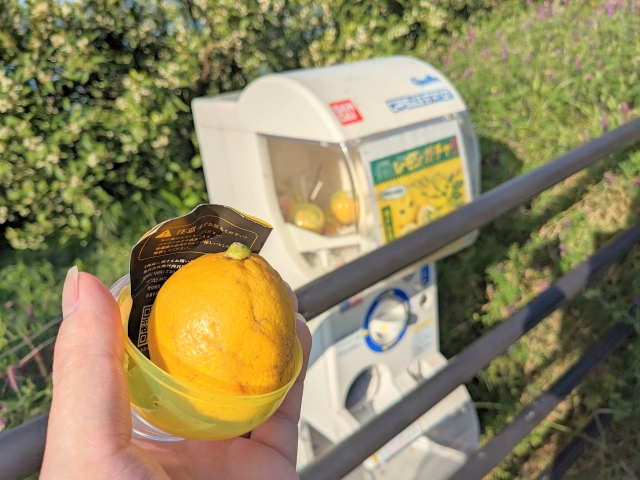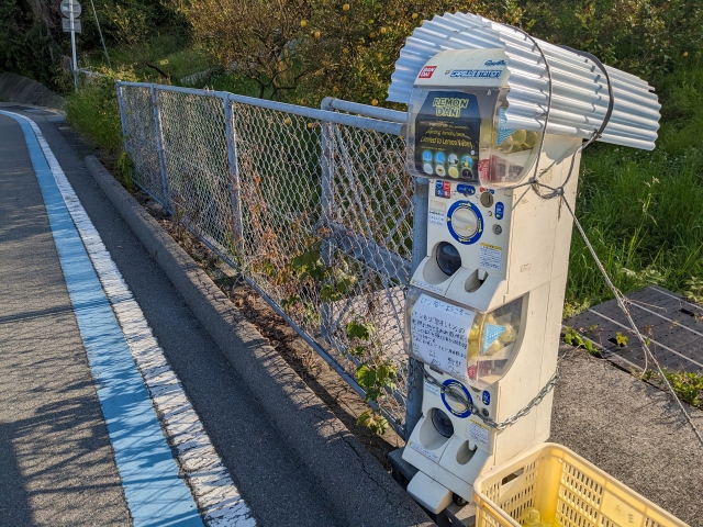 このレモン谷の名物といえば、こちらのレモン谷ガチャ!農道のような細い道に唐突に現れます。