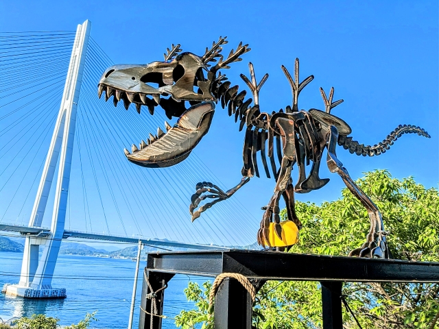 レモン谷ガチャの少し先にはレモン谷休憩所。そのすぐ側には「怪獣レモンの骨格標本」が置かれています。広島県のブランドレモン『怪獣レモン』を販売する瀬戸内百姓と、ジュラシックデザイン・ケータ、鉄骨アーティストNobuoというコラボによって生まれたそう。枝のような突起と握りしめたレモン、そして多々羅大橋をバックにした姿がなんとも魅力的。