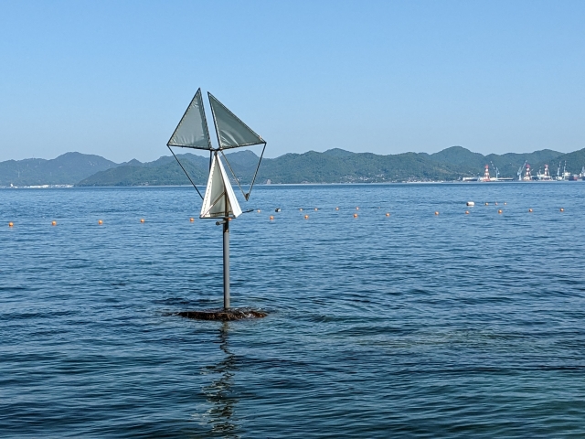 瀬戸田サンセットビーチから1kmほど北へ進んだあたり、海の中からそびえる不思議なオブジェが。こちらは《波の翼》by 新宮晋。白い三角形の帆は、風景にすっかり溶け込んでいます。