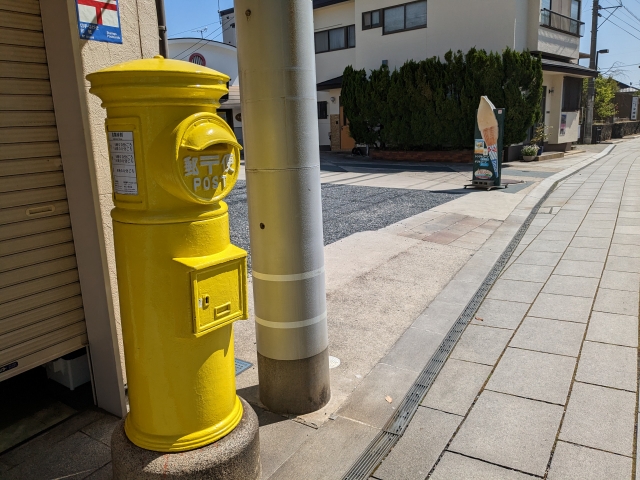耕三寺博物館の目の前には幸せのレモンポストがあります。レモンイエローの染められた丸型ポストはとってもかわいらしいです。