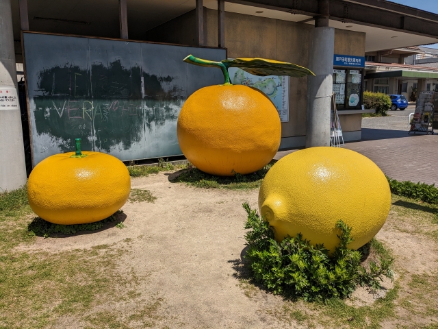 瀬戸田町観光案内所の目の前にはレモンをはじめとした柑橘トリオのオブジェ。思ったより大きいので、柑橘に囲まれたような写真が撮れます。