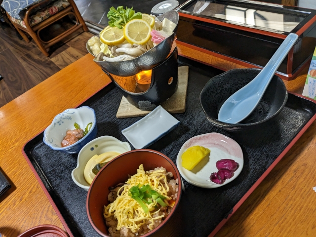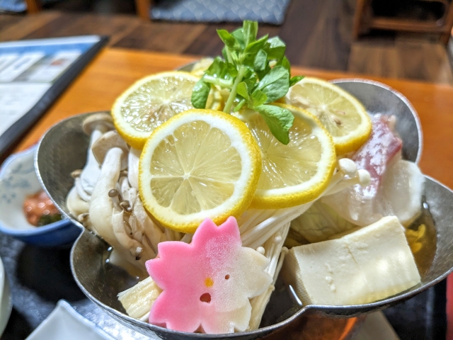 レモン鍋の具材はタコ、シメジ、豆腐、白菜など。レモンの酸味がとにかく絶妙で、一気に飲み干せるほどです。ポン酢系の味が好きな方にはめっちゃ刺さるお味。