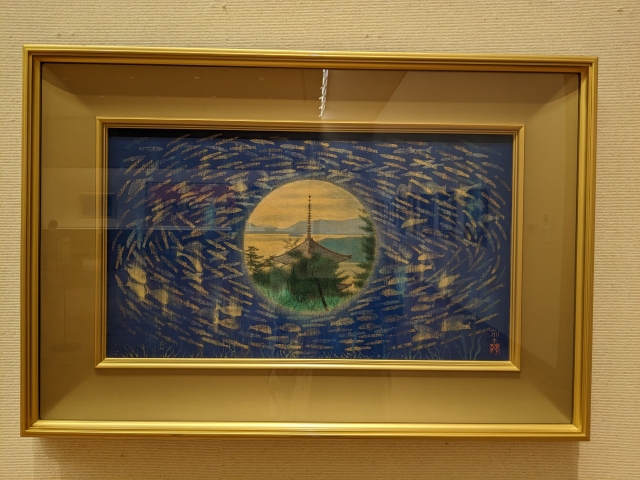 ここに描かれているのは生口島の瀬戸田に今もそびえる向上寺三重塔。そのまわりに広がるのは青い海を泳ぐ金色の魚群。ふるさとの瀬戸田は平山にとって心の桃源郷であったのではと考えさせられます。