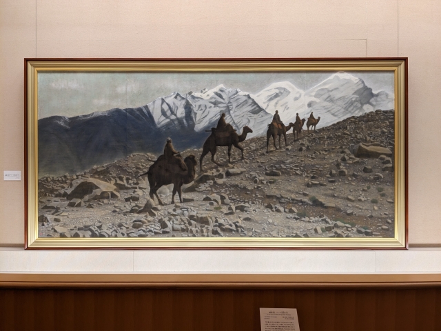 同じくキャラバンが描かれた《絲綢(しちゅう)の路 パミール高原を行く》。険しい山道を進むキャラバンの力強い姿が描かれています。こちらは集大成とも呼ばれる「薬師寺玄奘三蔵院の壁画」の翌年である2001年に完成されたもの。さらなる険しい道を進むという自身の決意の表れともとれます。
