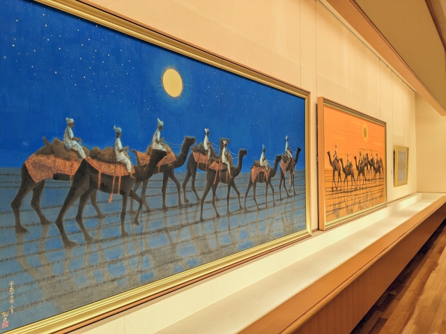 2つの大きな絵画は、《シルクロードを行くキャラバン》。手前は月が輝く夜、奥は太陽が照りつける日中。キャラバンの進行方向も逆になっており、対になった作品です。