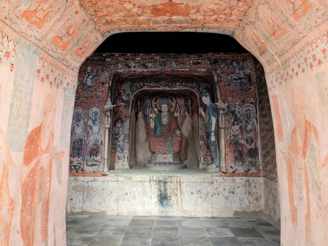 多数の石窟内部には、4世紀から千年に渡り彫られ続けていった数多の仏教壁画が残されており、砂漠の大画廊ともいわれています。