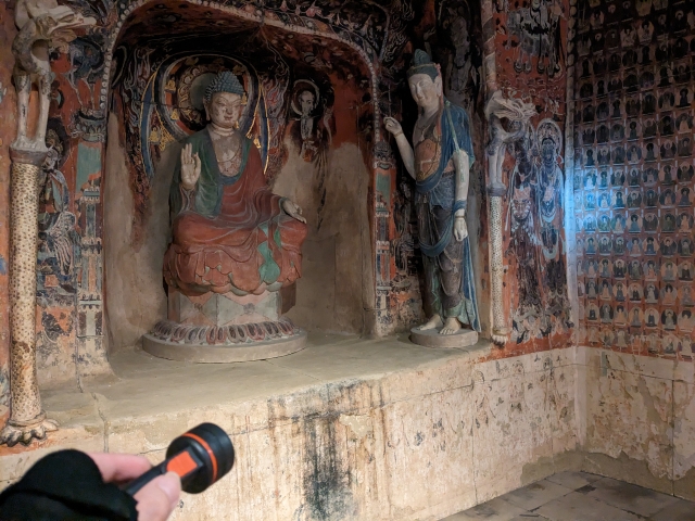 展示室の奥には、スーパークローン技術によって再現された莫高窟があるのです!!置かれたライトで照らして探検気分を味わうことができます。展示室の一角という小さなエリアではありますが、神秘的な雰囲気を存分に体感できるユニークな展示です。