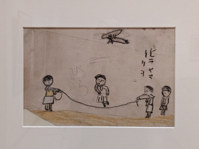 こちらは5歳頃に描いた作品《なわとび》。まだあどけなさの残る微笑ましい作品ですが、背景の空に描かれたセスナ機から、既にキャンバス内での奥行きを感じさせます。