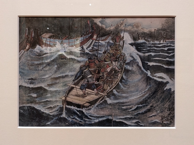 14歳のときの作品《元寇の役》。迫力のある構図、細やかな書き込み、うねる波・・・。今にも動き出しそうな臨場感ある作品です。他にも「桶狭間に向かう織田信長」「曾我兄弟復讐之図」などが展示されており、歴史が好きな少年であったと推測されます。
