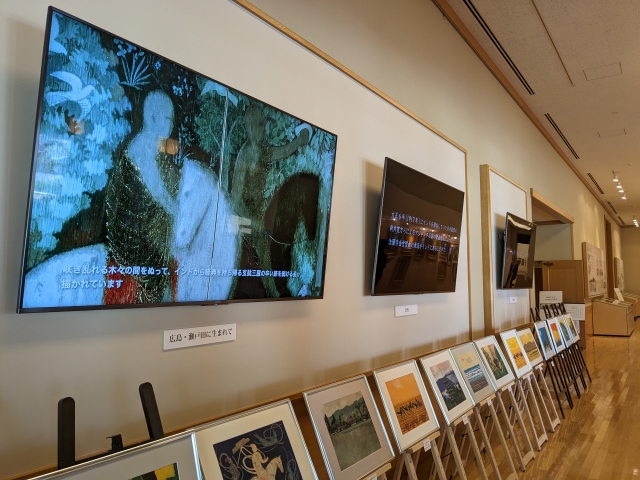 受付を進むと、展示室の手前のギャラリーにはモニターが設置されています。ここで流れているのは、「広島・瀬戸田に生まれて」「敦煌」「桃源郷」という、各展示室におけるテーマに沿った内容の映像。