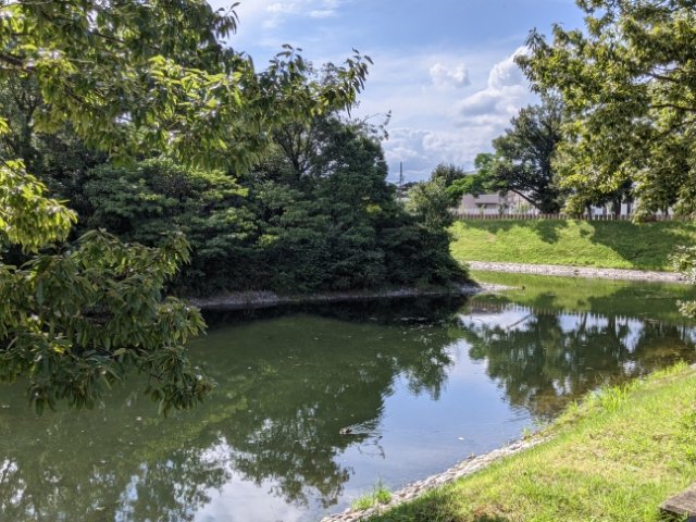 周囲には内濠、外濠と二重の濠が張り巡らされています。一部分には水が蓄えられており、水鳥が集まる様子がとっても美しい。