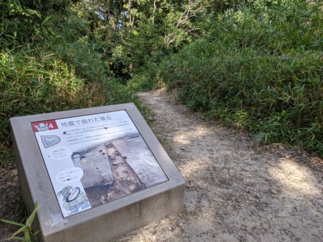 墳丘の上も散策可能。木々が茂っていますが、道はきちんと整備されているため、気軽に森林浴が楽しめます。わかりやすい解説パネルもところどころに設置されており、散策しながら古墳の仕組みを学ぶことができます。