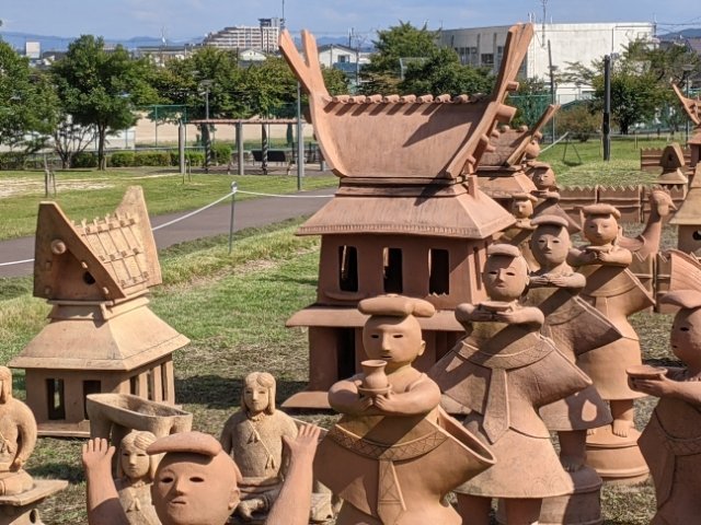 高さ170cmの国内最大の家型ハニワも。千木や鰹木など、神宮のようなつくりをしており、神社ではないかとも考えられているそう。