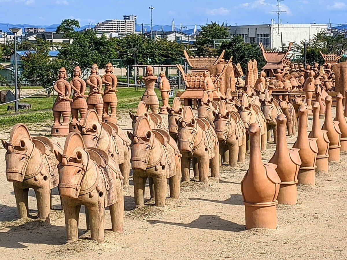 淀川流域最大規模の前方後円墳。公園として整備されており、墳丘上も含めて自由に散策することができます。圧巻なのは200体にも及ぶハニワがずらりと並ぶ祭祀場。様々なモチーフのハニワたちは、ユーモラスな姿で訪れる人を楽しませてくれます。