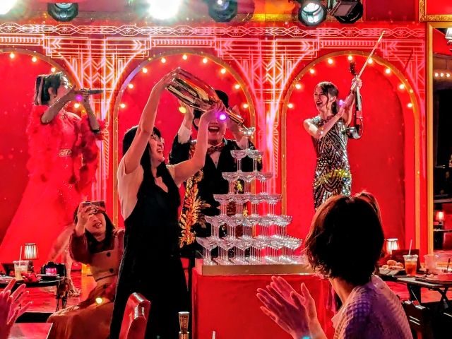 観客も参加してカンカンダンスやシャンパンタワーも。
