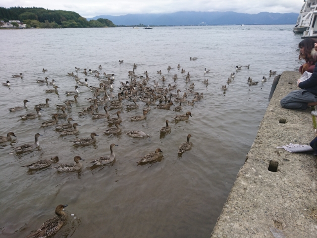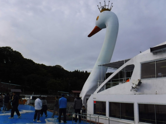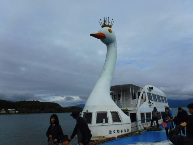 ひとしきりカモと遊び、ふと視線をあげると、巨大な鳥がこちらを見ています。この巨大白鳥は、猪苗代湖遊覧船「はくちょう丸」。