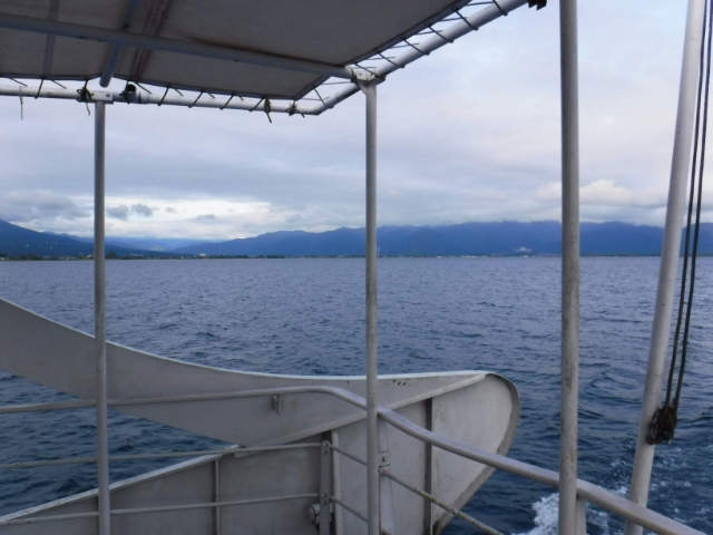 10月半ばともなると、冬を感じさせる冷たい風が吹きます。でも、寒さに負けずにデッキへ!海風と違い、湖風はべたべたしないので気持ち良いです。