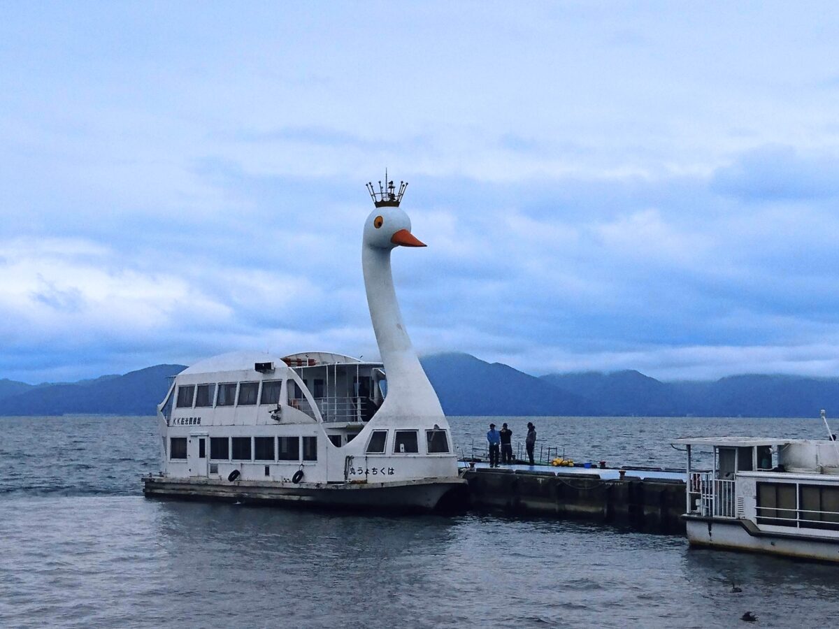 磐梯山の麓に広がる広大な猪苗代湖(いなわしろこ)。そこにはおびただしい数のカモ、そして白い巨鳥『はくちょう丸』の姿が。乗船すれば、波穏やかな湖上をゆったりとめぐることができます。