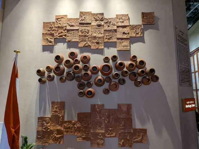 壁にびっしりと並ぶのは多数のツボとレリーフ。こちらは「土の絆」と題されています。このオブジェは、インドの各州と連邦直轄領から集めたもの。土を通して国の団結を示しているそう。
