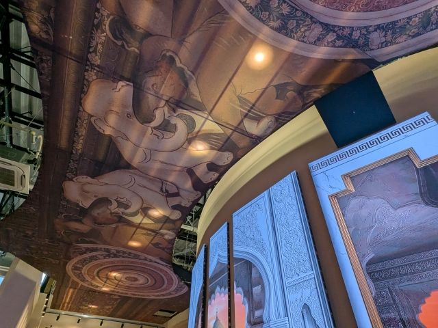 続く展示室も、法螺貝のガネーシャ、木製の孔雀などが並んでおり、これぞインドといった雰囲気。天井に描かれたゾウは、まるで寺院の天井画のようです。