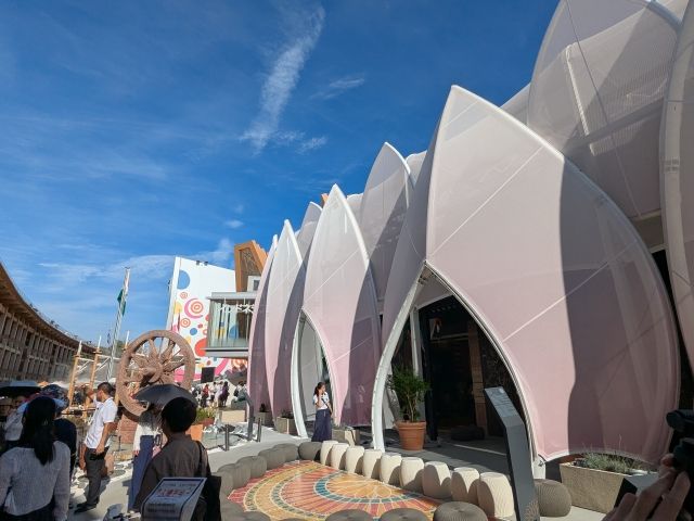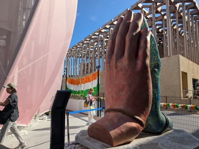 パビリオンの前には手のモニュメントも。合掌した姿は、インドらしさが全開です。スピーカーからは陽気な音楽が流れ出し、インド映画の如く今にも踊りだしそうな雰囲気も。