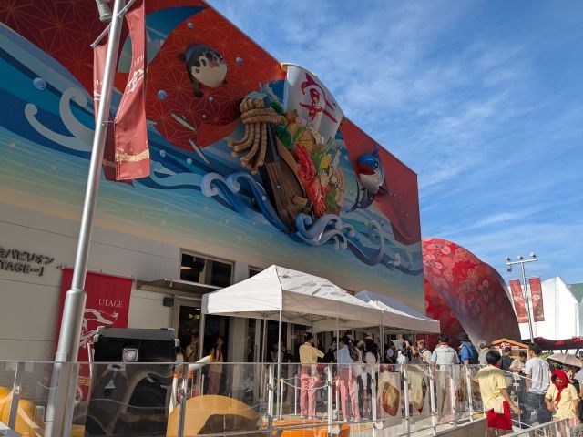 気になりますが、少々列が伸びていたので、すぐ近くにあるORA外食パビリオン『宴~UTAGE~』へ。様々な飲食店が入るフードコートのようなパビリオンで、食に関連する展示もあります。ただし座席はないので、テイクアウトして外のベンチなどで食べる感じです。