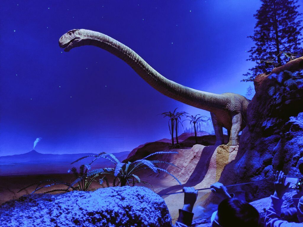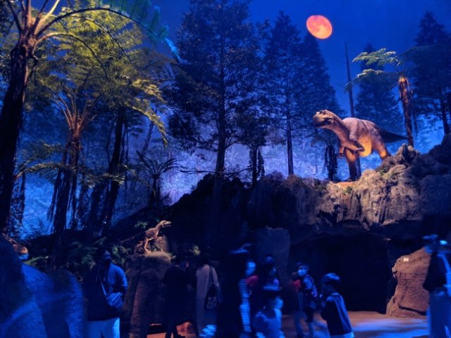 展示室を進んでいると、「エンバイラマ館」への入口があります。ここは3億年前の地球を紹介したゾーン。まるで洞窟のような通路を進んで行くと動く恐竜が暮らす世界にたどり着きます。マメンチサウルスやイグアノドンなどの恐竜たちが生活する姿は迫力満点!アトラクションのような演出なので、子供も大人も楽しめます。