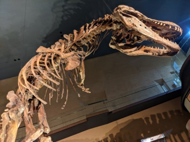 目をひくのは、巨大なティラノサウルス。発見者の名にちなんで「スー」という愛称で知られている化石で、本物はシカゴのフィールド自然史博物館にあるそう。