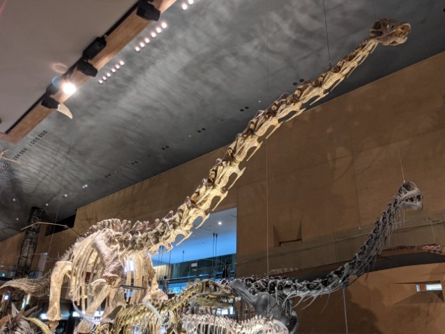 首を高く持ち上げているのはセイスモサウルス。35mにも及ぶその大きさは、これまでに組み立てられた恐竜骨格の中でも世界最大級とのことです。