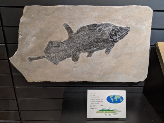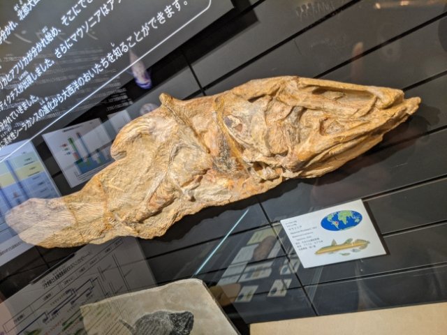 こちらはマウソニアというシーラカンス。中生代のブラジルに暮らしており、深海ではなく浅い海や湖に暮らしていたそう。この種はとても大型で、最大4mにも及んでいたと考えられています。