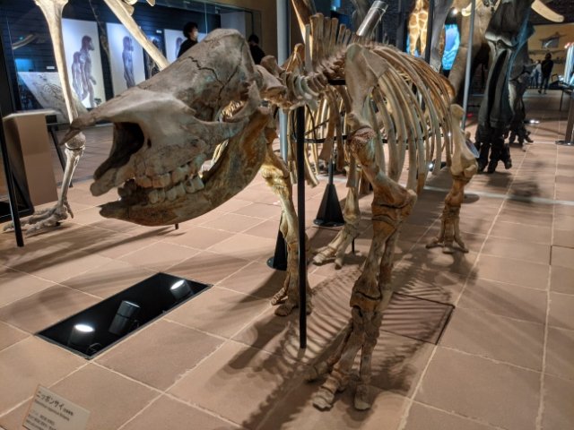 こちらはニッポンサイ。栃木県で発掘されたサイの化石です。今では5種類しかいないサイも、かつては非常に多くの種類が存在しておりました。世界中に分布しており、日本にも様々なサイの仲間が暮らしていたそうです。