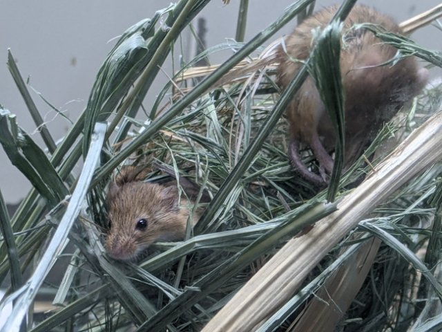 ここでは生体展示も行っています。この水槽で見ることができるのはカヤネズミ。草原に暮らすネズミで、草を使って丸い巣を作ります。福岡県の絶滅危惧種に指定されている動物です。