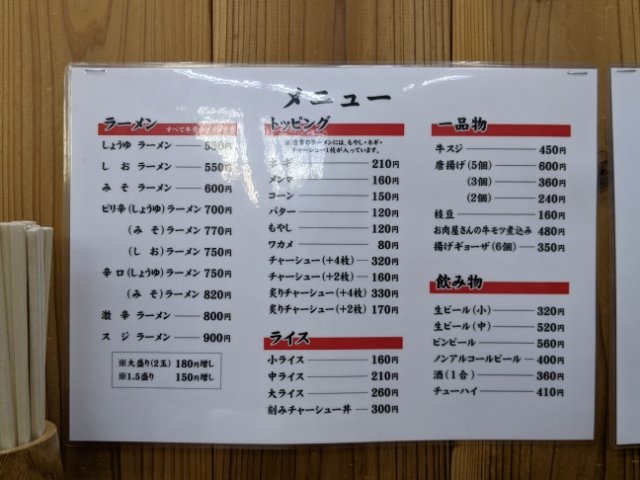 メニューはしょうゆ、塩、みそなどそろっていますが、もちろん全て牛骨スープ!いろんな形の牛骨ラーメンが楽しめます。1.5盛や大盛り、メンチや唐揚げがついたセットメニューもあるので食いしん坊も満足できるはず。