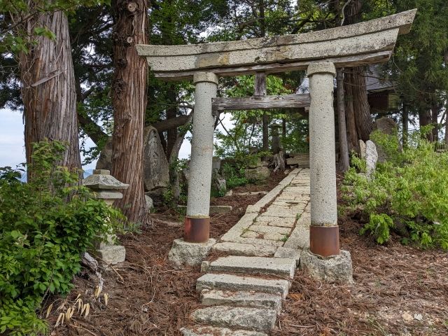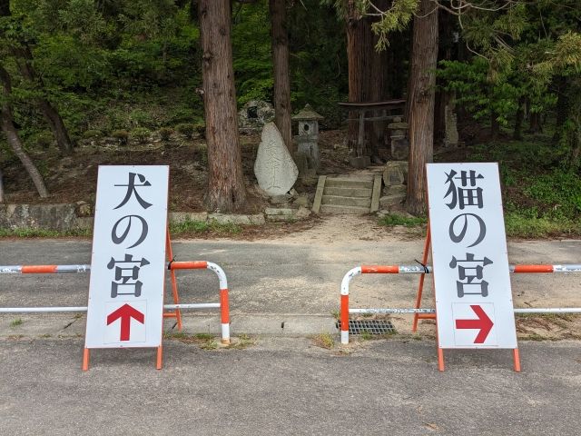 犬の宮から歩いてすぐのところにある猫の宮。こちらは少し開けた場所に建っています。参道には、これまた石と木を組み合わせた鳥居。この地域の特色なのでしょうか。