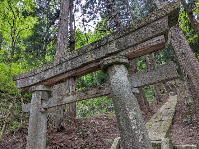 木立に包まれた鳥居をくぐっていきます。この鳥居、よく見ると石と木を組み合わせています。部分的に材質が分かれているかと思いきや、2つの柱を貫通する「貫」の部分が、途中から石に変わるという、独特な組み合わせ。
