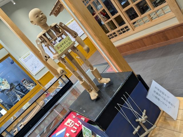 平日2回、土日祝日は5回ほど、からくり人形の操作実演も行われています。他にも、実際に操作できる体験型人形も。両手両足、首が動くのですが、紐の数が多くなかなか複雑。スムーズに動かすには、かなりの練習が必要です。