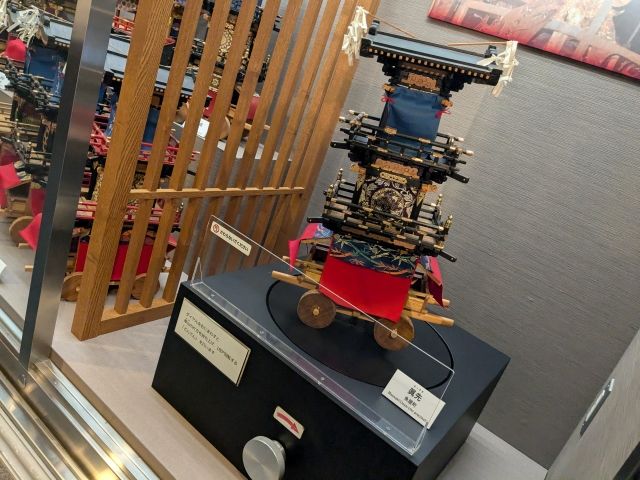 2階からも眺めることができます。この車山は、3層構造。展示されているものはいずれも幕や提灯で見えませんが、最上層には「からくり人形」が搭載されています。