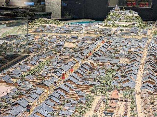 間口によって税が徴収されたので、間口は狭く奥行きが深い造りの町家がずらりと並んでいます。木曽川の上流と下流をつなぐ物流拠点「犬山湊」や犬山城の守護神である「針綱神社」、そして町を巡行する犬山祭の車山(やま)の姿も。人も多数置かれており、細かく見ていくとヒューマンドラマも見え隠れします。