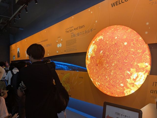 入館してすぐ目に入るのは、イータ国際核融合エネルギー機構のブース。「イータ(ITER)」はラテン語で「道」という意味。核融合の仕組みや安全性、燃料効率などを研究する実験プロジェクト。核融合ときくとなんだか妙な凄みを感じますが、原子力発電よりも放射性廃棄物が少なく、安全性も高いそう。