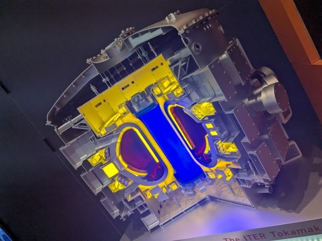 こちらは南フランスで建設中の「トカマク(Tokamak )」の模型。30m×30mという世界最大の核融合施設であるそう。よく見ると人間の模型も置かれており、その規模を感じることができます。