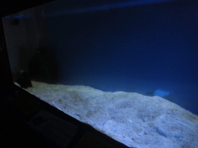 何もいない水槽に見えますが、これはカスザメ水槽。カスザメは常に砂にもぐっているため、「世界一つまんない水槽」となっています。