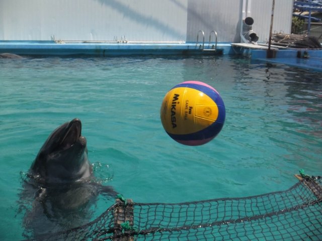 ボールをくわえたバンドウイルカがいました。このイルカ、加えていたボールを水に浮かべると、そっと人の方へ流してきます。そして、少し離れたところで口を開けて待機。