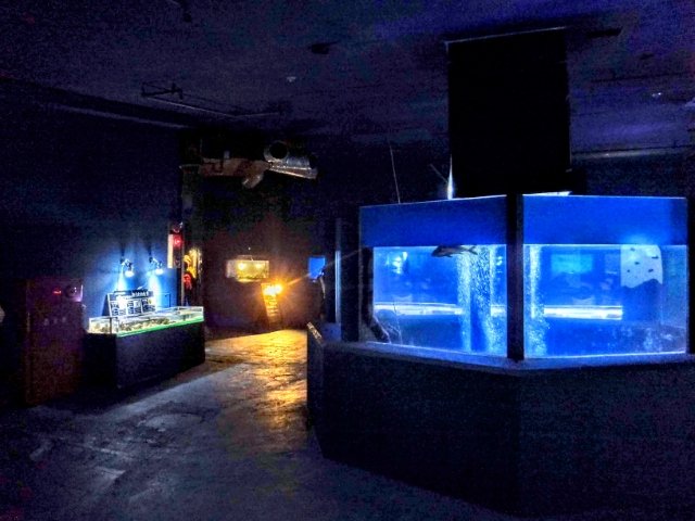 水槽が並ぶ展示室は照明が少し暗めに設定されています。ちょっとしたアジト感が漂いわくわくします。