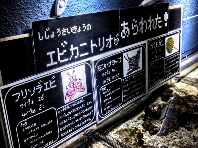 ポケモン風に描かれた案内板。水槽だけでなく、まわりに書かれた説明がとても遊び心あふれています。ヒトデを溶かしながら食べるフリソデエビの得意技はもちろん「ようかいえき」です。