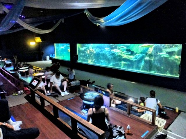 館内の大水槽。一見すると普通の水槽ですが、なんと座敷席が設置されています。