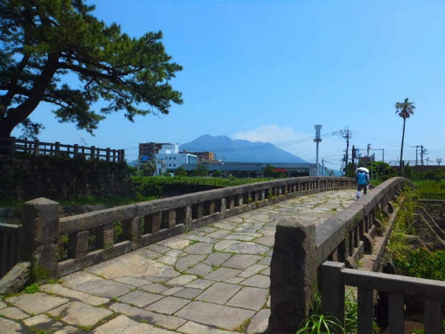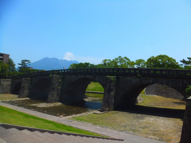 2つ目の橋は、こちらの高麗橋。先ほどの西田橋と同じく4連アーチタイプの橋で、バックには力強い桜島の姿が見えます。