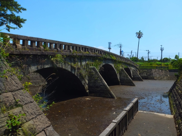 ずっしりと構える4連アーチの石橋。全長50mにも及ぶ立派な姿で、鹿児島県の有形文化財にも指定されています。
