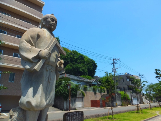 この橋の近くには、橋を造った石工・岩永三五郎の銅像が。腰に差した刀から、帯刀を許される身分であったことが想像できます。
