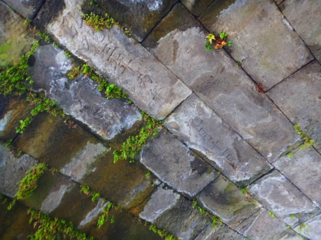 石橋の下をくぐり見上げてみると、そこには刻まれた「弘化三年」の文字が。この橋は1846年に架設されたものなのです。