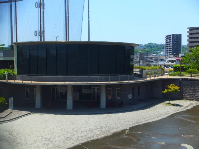 橋の上を歩くと、向こうに桜島が見えます。この桜島ビューは、移設された結果かもしれません。